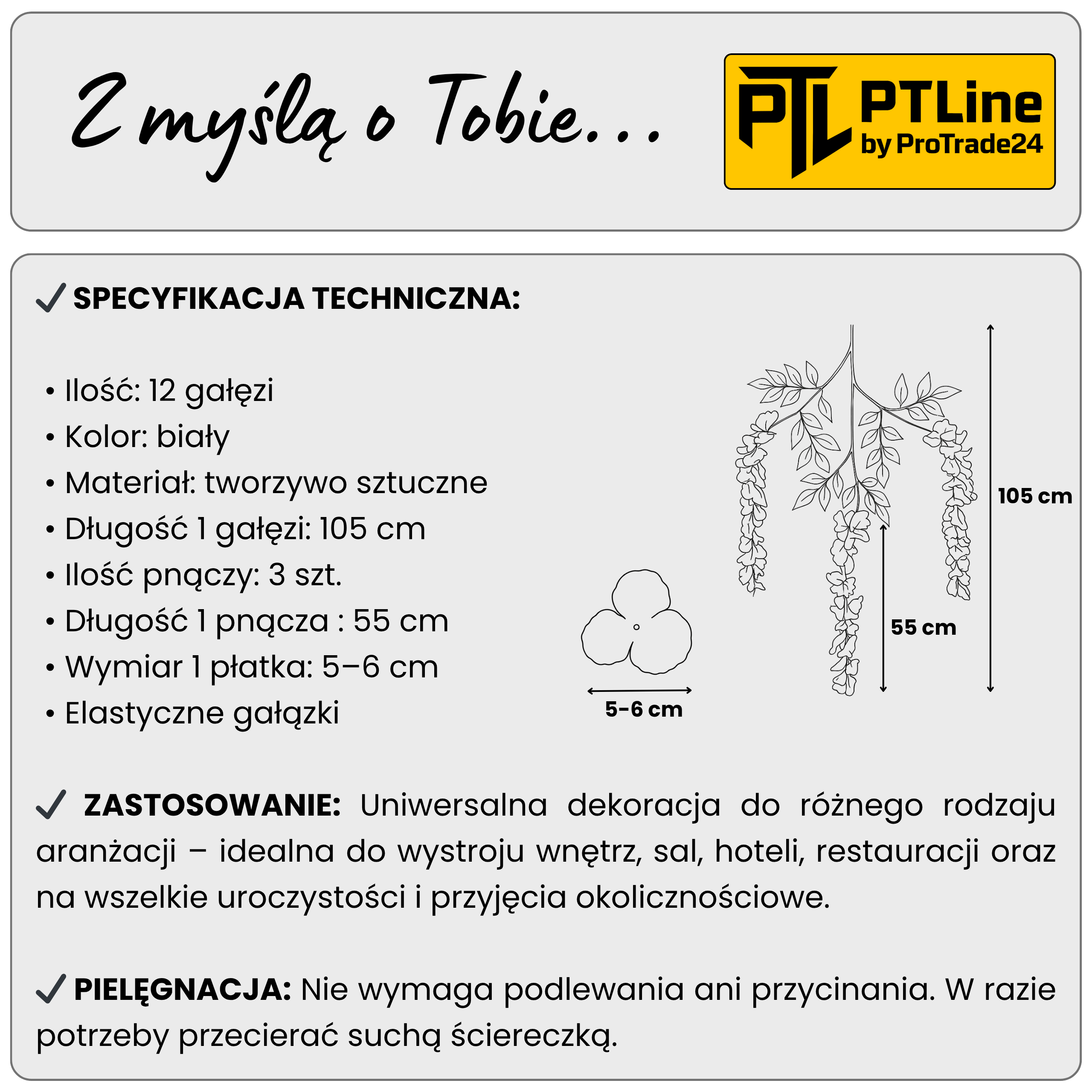 Sztuczna girlanda wisteria glicynia XXL – zestaw 12 gałęzi po 105 cm. Gęste i efektowne kwiaty o naturalnym wyglądzie. Idealna dekoracja na ślub, wesele, komunię oraz do domu, ogrodu i restauracji. Elastyczne gałązki ułatwiają formowanie aranżacji.