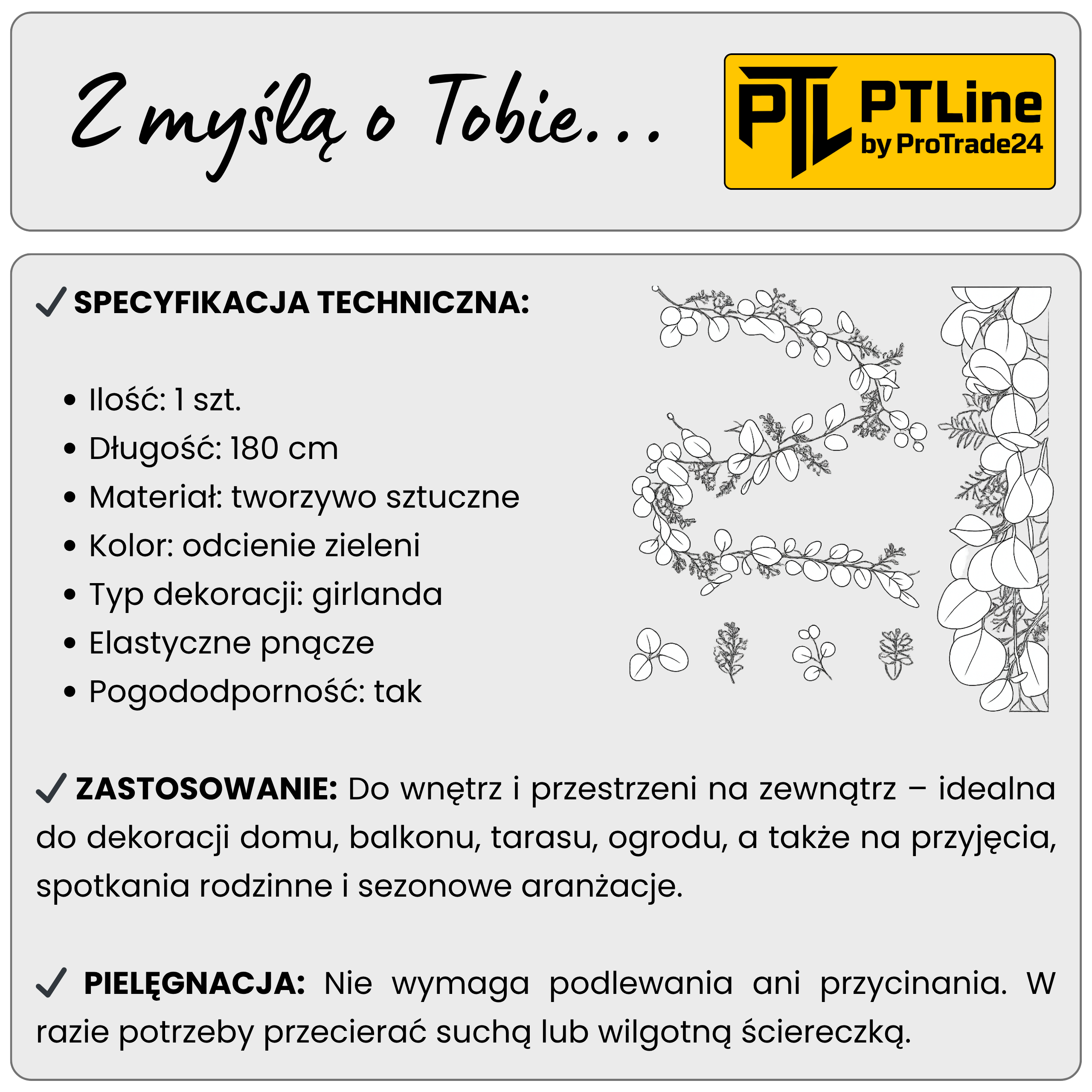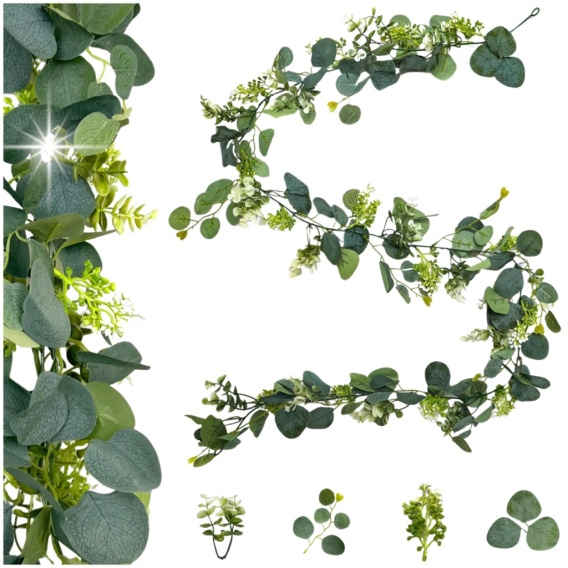Sztuczna girlanda eukaliptusa 180 cm – dekoracyjne pnącze o realistycznym wyglądzie. Elastyczna konstrukcja i odporność na warunki atmosferyczne. Idealna do domu, ogrodu, balkonu, tarasu, a także na śluby, komunie i urodziny. Łatwa w montażu i formowaniu.
