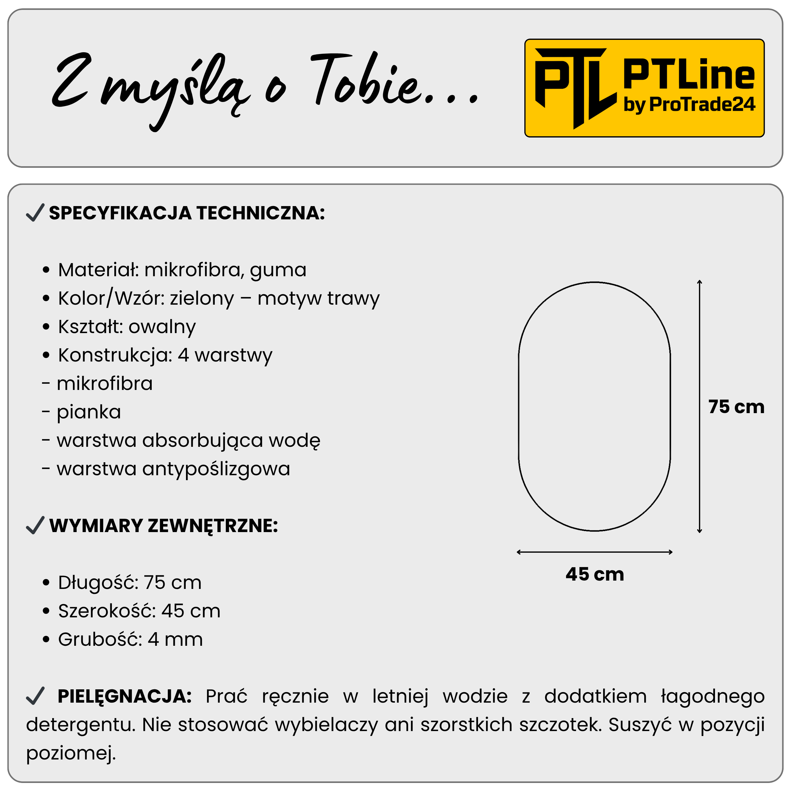 Mata łazienkowa szybkoschnąca 45×75 cm, owalna, zielona (trawa). Chłonna, wygodna i bezpieczna. Szybko schnie, nie przesuwa się i dobrze izoluje od podłoża. Łatwa w czyszczeniu. Idealna do łazienki, kuchni, na balkon i na taras.